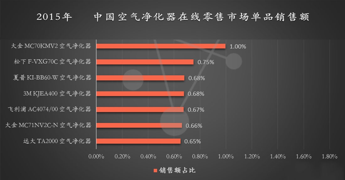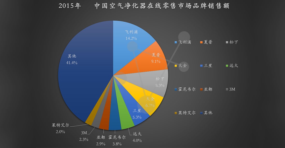 据家电网查阅,2015年上半年线上净化器零售额规模58.1亿元,下降20.5%;供给零售量规模为298万台,同比下降10%;品牌数为734个,线下品牌数为102个,相比2014年发生了较大的变动,净化器在2015年上半年整体呈现低迷的状态,但是在2015年下半年又迎来了一个小高潮。中怡康数据显示,空气净化器市场在2015年年初经历了大跳水,凭借第四季度的强势反弹才保证了整体市场规模与去年持平,零售量累计销售514万台,零售额达到117亿元。
