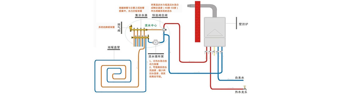 以温度不高于60℃的热水为热媒,在埋置于地面以下填充层中的加热管内循环流动,加热整个地板,通过地面以辐射和对流的热传递方式向室内供热的一种供暖方式。在铺设地板的地方:水暖占用层高在6-8cm;在铺设地砖的地方:水暖占用层高在4-5cm。