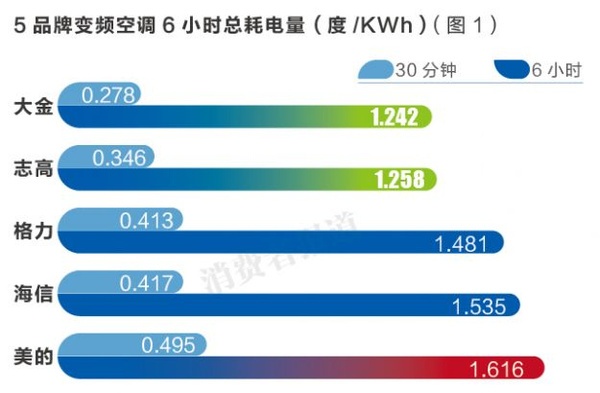 2016年3月,《消费者报道》送检了格力、美的、海信、志高和大金等5品牌的1.5匹、3级能效变频空调至第三方检测机构,模拟消费者日常使用方式,对5款变频空调在6小时内的温度变化和耗电量进行测试。