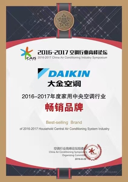 8月26日,2016-2017中国空调行业高峰论坛在北京召开,对2016冷年以及2017冷年空调行业分别进行了盘点和发展趋势分析。本次会议由中国家电网主办、中国家用电器协会、国家信息中心、中怡康等权威机构专家一同出席。大金空调获评2016-2017年度家用中央空调行业畅销品牌,再次展现了大金作为国际品牌的雄厚实力与品牌魅力。