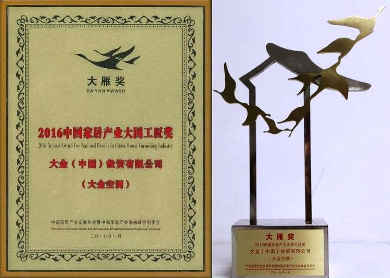 2017年1月7日,在北京国家会议中心举行的第四届中国家居产业发展年会暨2016年度中国家居产业“大雁奖”颁奖盛典上,大金空调荣获“2016年度中国家居产业大国工匠奖”称号。