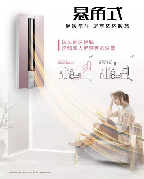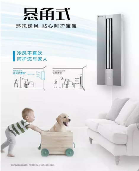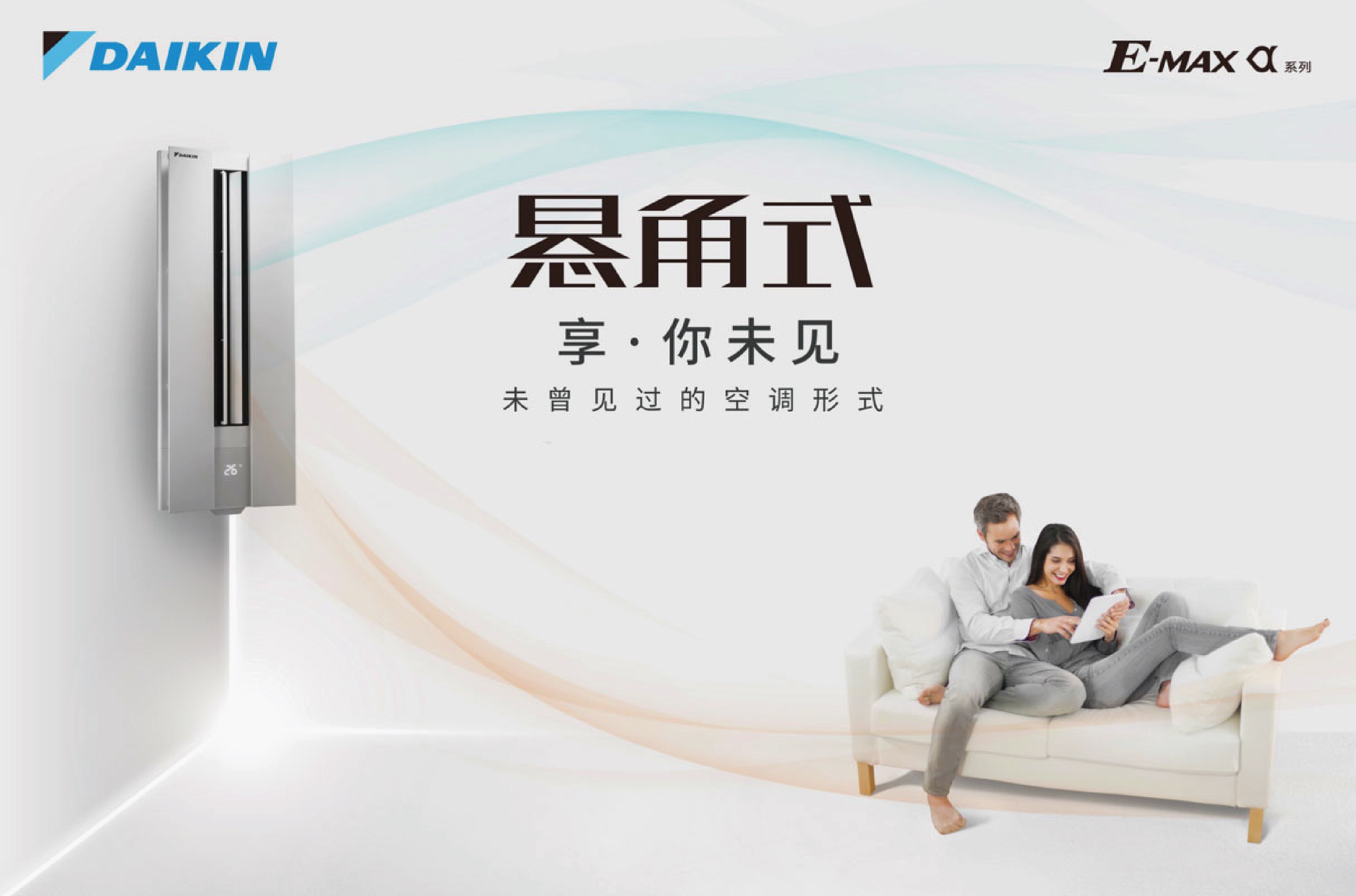 全新E-MAX α系列悬角式空调,革命性的悬角设计,可悬挂于客厅转角,为客厅释放出更多黄金空间。