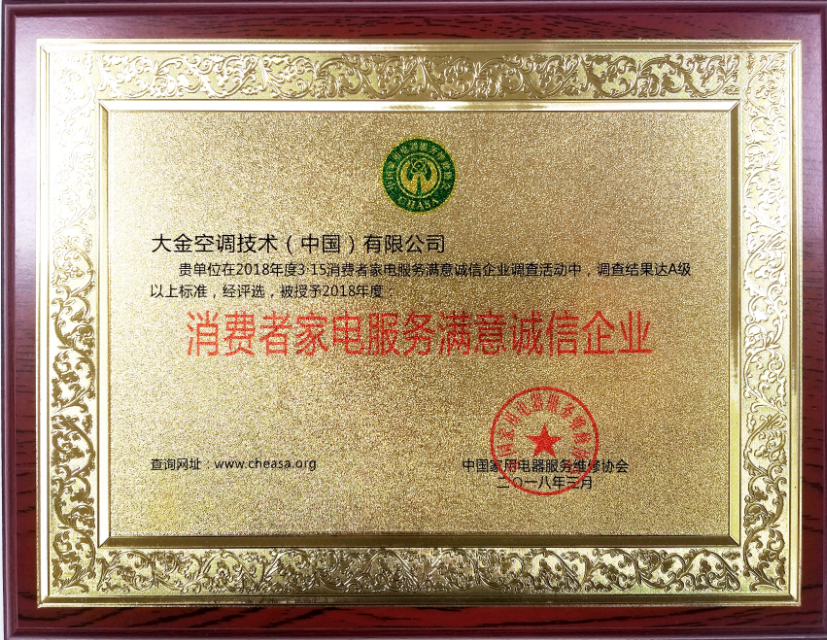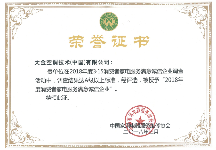 近日,由中国家用电器服务维修协会主办,以“开启品质消费美好生活新时代”为主题的“3·15消费者权益保护革新大会”在京隆重举行。大会公布了“2018年度家电服务业消费者权益保护调查”结果,大金凭借过硬的产品品质和完善的服务体系赢得广大消费者青睐,被授予“2018年度3.15消费者家电服务满意诚信企业”,及“2018年度消费者权益保护示范性企业”双项殊荣。