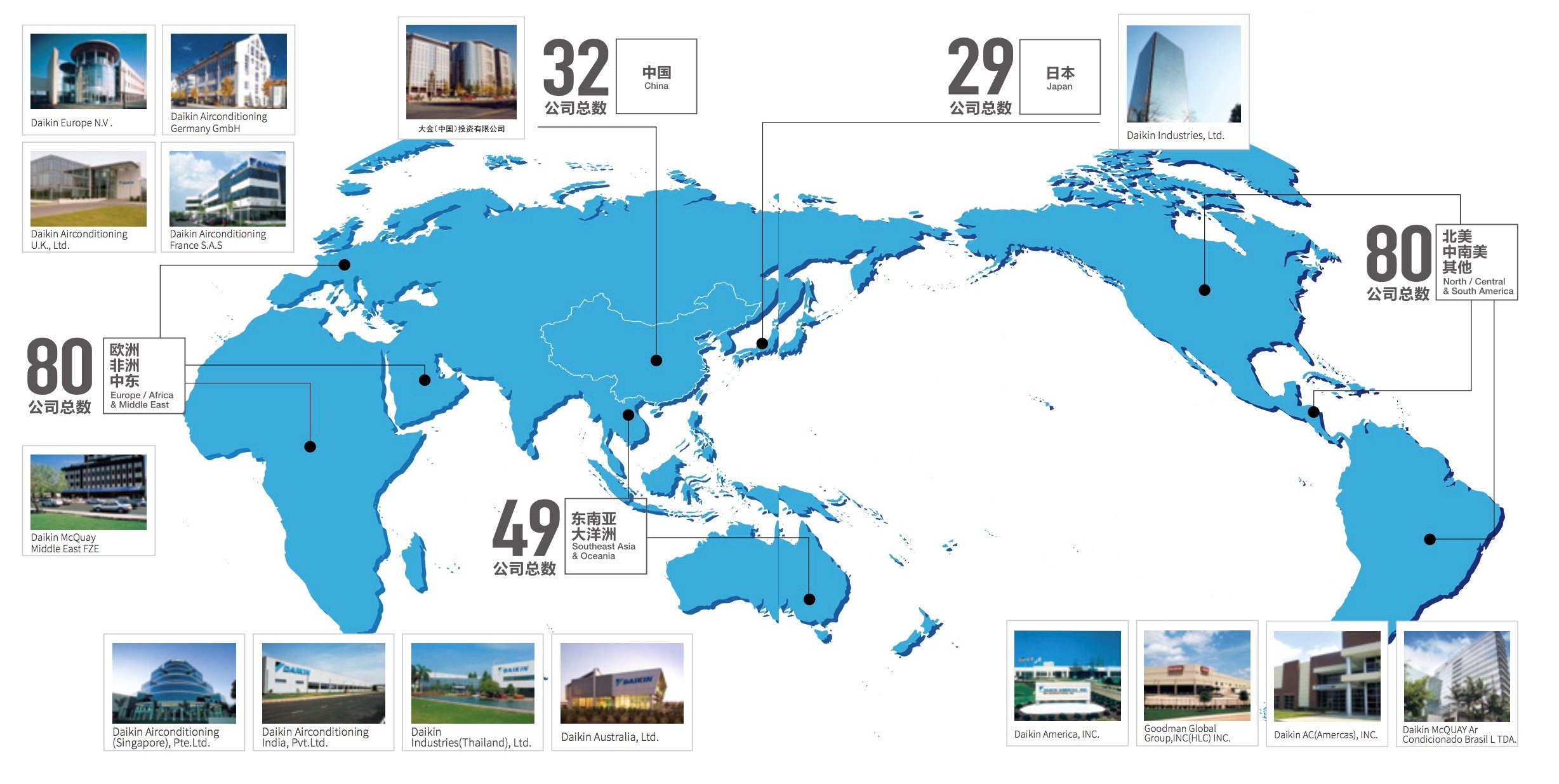 截至目前,大金集团旗下拥有大金、麦克维尔、Goodman等世界知名空调品牌,全球公司数达到269家,员工数近7万余人。如今,大金已经在美国、加拿大、日本等28个国家拥有90多家生产基地,事业已遍布全球150多个国家。